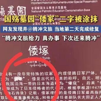 4月23日,云南腾冲国殇墓园出事了!一名游客发现"倭塚"石碑上,"倭"字被人用涂料恶意涂抹!字迹模糊不清。游客当场拍照,发到网上,照片迅速传开,登上热搜。无数网友看完现场画面后,纷纷发声谴责这种荒唐又无知的行为。